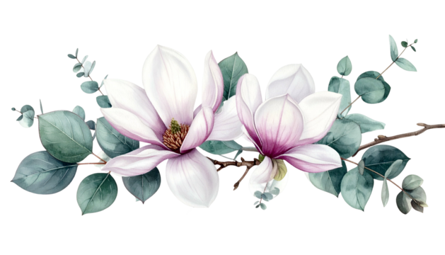 Delicate floral arrangement featuring white magnolias and dusty green foliage on black