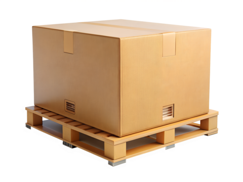 A cardboard shipping box on a wooden pallet, isolated on transparent background