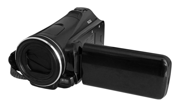 Black Portable digital Full HD video camcorder isolated on transparent background. Video camera with open LCD screen