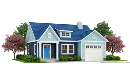 Collection of Four Modern American Suburban Houses with Blue Siding Isolated on a Transparent Background