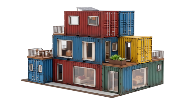 Detailed miniature model showcasing an innovative multi-story architectural concept for sustainable living, crafted from repurposed colorful shipping containers as a modular dwelling