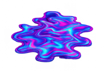 Abstract liquid splash with vibrant iridescent pink, purple, and blue glitched colors, creating a fluid and dynamic abstract shape on transparent background