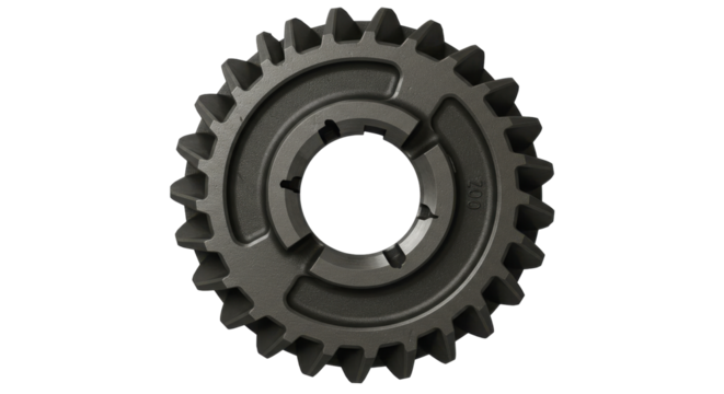 Close-up of a black gear cog showcasing intricate teeth design isolated on white background
