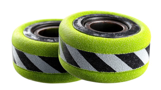 Colorful Wheel Focus: Two vibrant green wheels, with striking black and white stripes, are isolated against a subtle backdrop, offering a dynamic perspective.