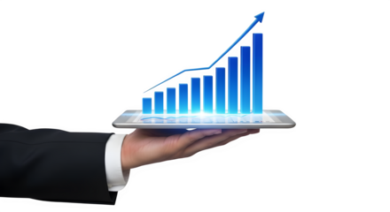 Confident professional presents dynamic upward trending blue bar graph on tablet, showcasing business growth and financial success.