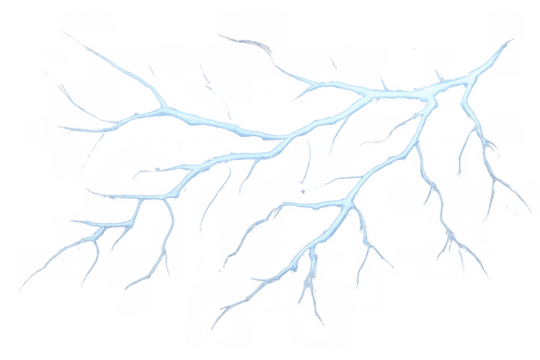 bright blue and white lightning bolt with branching electrical discharge, cutout, PNG isolated on white or transparent background