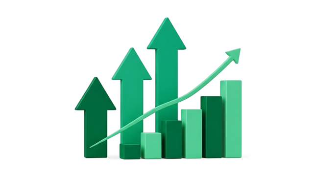 A dynamic 3d illustration of a green bar graph and upward arrows symbolizing significant growth isolated on transparent background