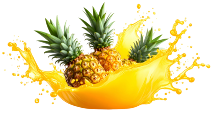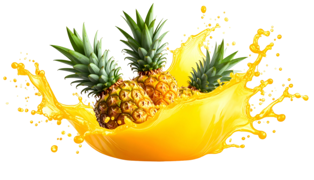 Three pineapples burst into vibrant juice, creating a dynamic splash on a black background