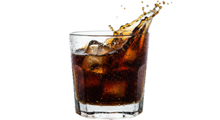Chilled clear glass rocks tumbler with cola and ice, one cube creating a dramatic liquid crown splash, isolated on transparent background. High-end beverage advertisement concept