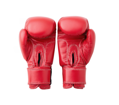 A pair of vibrant red boxing gloves positioned symmetrically on a clean white background. symbolizing sportsmanship and competition. ideal for fitness and martial arts promotions