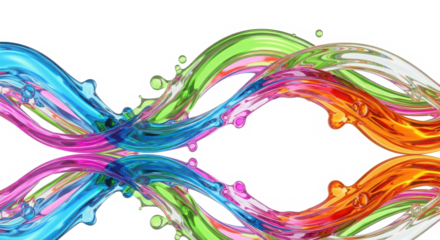 Vibrant swirling liquid paint splashes in a dynamic abstract wave pattern with a mirrored reflection isolated on transparent background