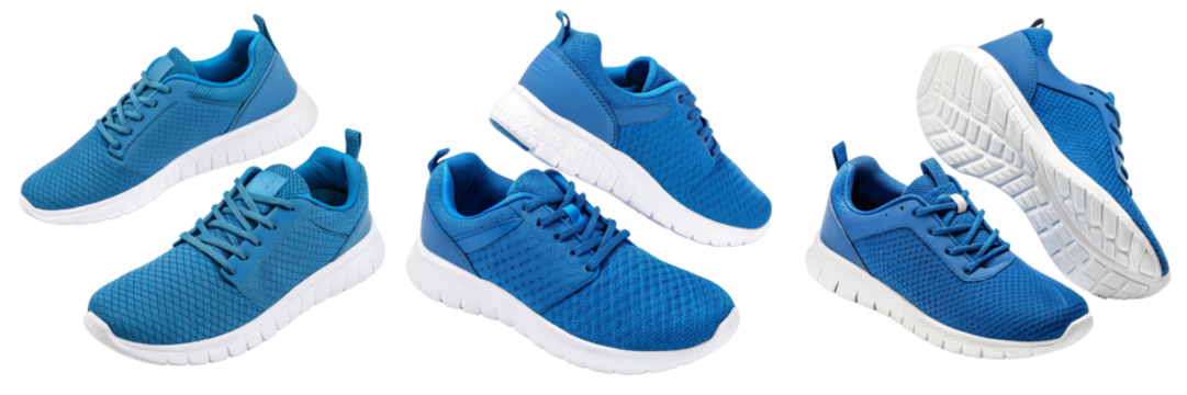Blue Sneakers Floating Composition, Five Shoes, Isolated on White Background, Athletic Footwear, Sneakers, Sports Shoes, Footwear