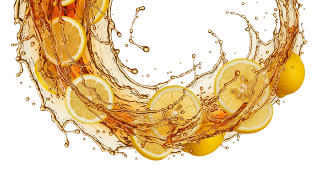 Refreshing burst of citrus: Slices of lemons in a dynamic splash of amber-colored liquid creating an energizing and invigorating visual experience