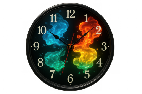 Colorful smoke swirling around circular timepiece, creating abstract pattern against transparent backdrop
