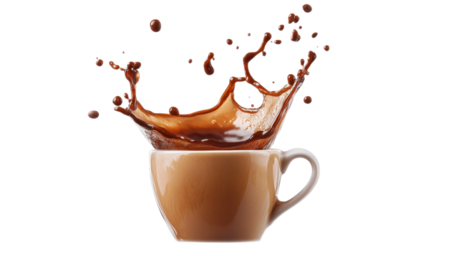 Dynamic coffee splash from white cup, morning energy boost, perfect for cafe promotion, breakfast menu, and coffee break ads, invigorating start to the day