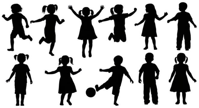 black vector silhouettes of diverse young children in dynamic poses (running, jumping, dancing) isolated on a transparent background, showcasing pure energy and spirit. concept of joyful childhood
