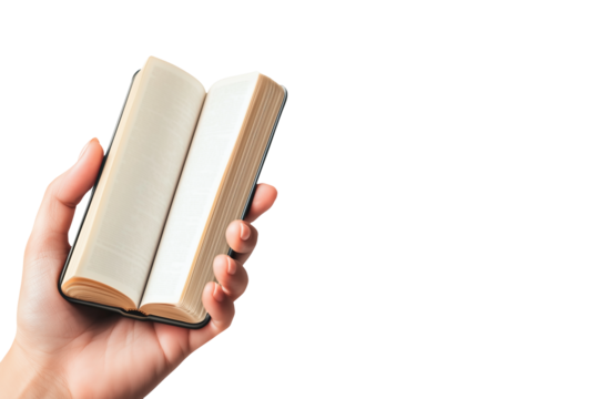 e book concept, woman hand holding open book with blank pages, isolated on white