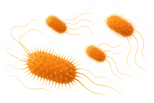 Microscopic gray bacteria with pili revealing complex cellular structures, magnified against transparent backdrop