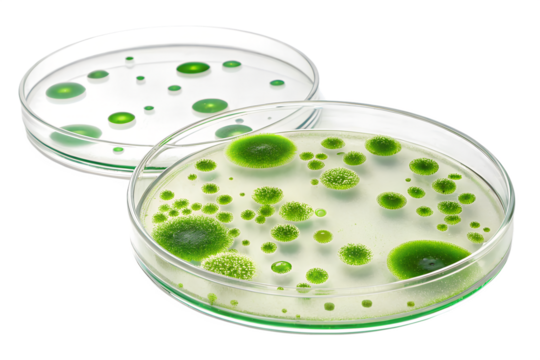 E coli bacteria growing on a petri dish bright green colonies in a sterile lab png transparent background.