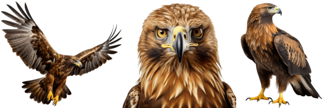 Golden eagle collection (portrait, standing, flying), animal bundle isolated on a white background as transparent PNG