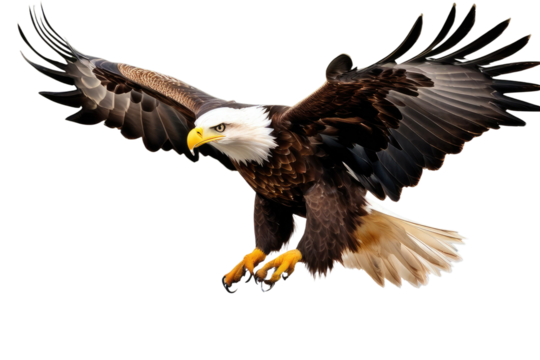 Majestic bald eagle in flight, wings spread wide, isolated on transparent background