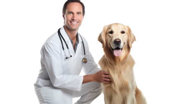 A veterinarian in gloves checks a dog's ears, a dog in a veterinary plastic cone