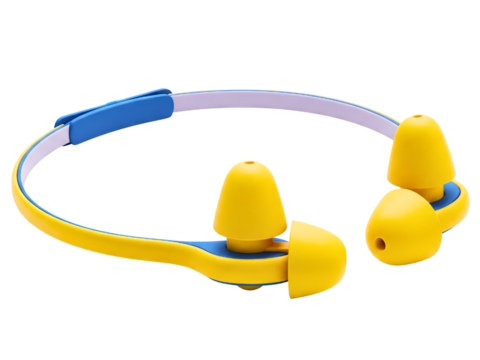 Pair of yellow earplugs attached to a blue cord on transparent background.