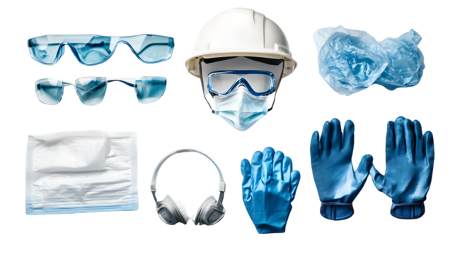 Industrial gloves, ear protection, and goggles, Transparent background, PNG file, essential for safety,