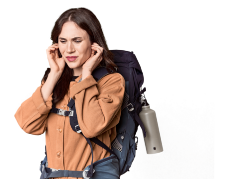 Young Caucasian with hiking gear and bottle covering ears with hands.
