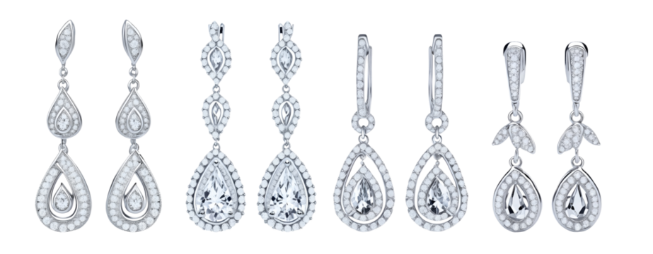 Set of beautiful teardrop bridal dangle earrings isolated on transparent background. Generative AI