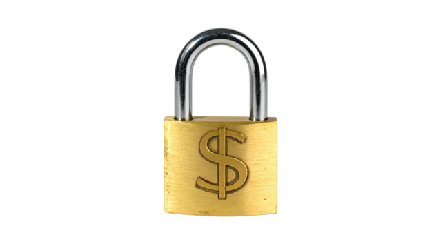 Gold padlock with dollar symbol centered, isolated on black background