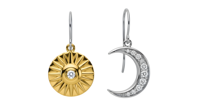 Sun and moon earring mismatched set, isolated on white background