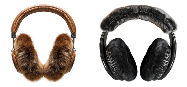 Happy woman wearing ear muffs holding colorful transparent shopping bags