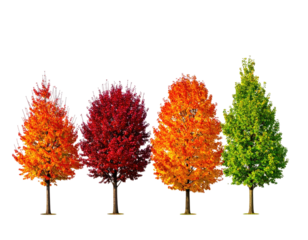 Four trees in fall, displaying a vibrant spectrum of colors, set against a transparent background