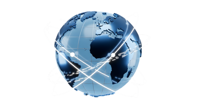 Earth globe with interconnected blue lines showcasing global network, communication, and technological connections on a transparent background. Illustrates worldwide digital connectivity.