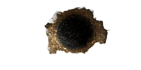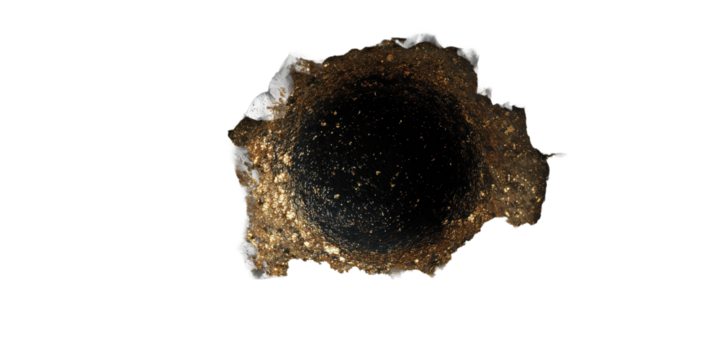 The Blast Hole: A close-up shot of a dark-colored and crater-like blast hole, highlighting the raw textures and harsh remnants of an industrial process.