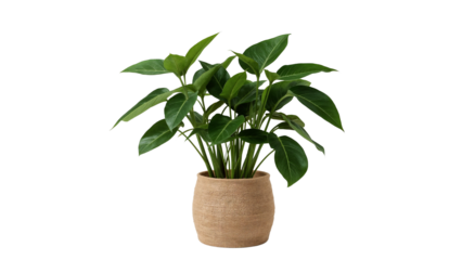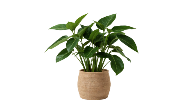 Indoor leafy plant in earthen pot against transparent backdrop evoking serenity and organic