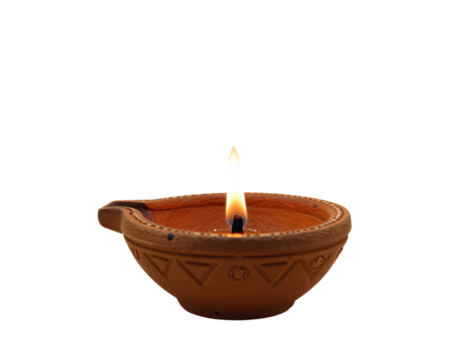 Traditional clay oil lamp with lit flame