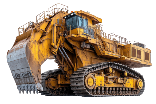 Massive yellow mining excavator with treads, bucket, and complex machinery