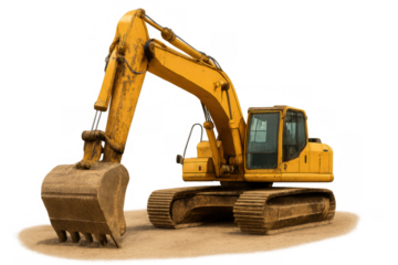 Yellow excavator on a patch of earth. Construction machinery performing digging and earthmoving tasks with a transparent background