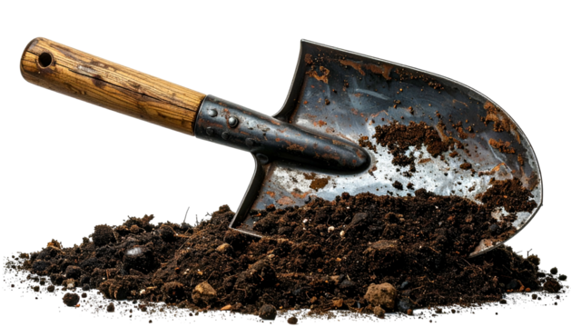 A well-used garden spade rests in a pile of rich, dark earth, ready for planting