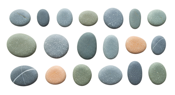 Assorted small stones and pebbles with varied textures and colors on transparent background