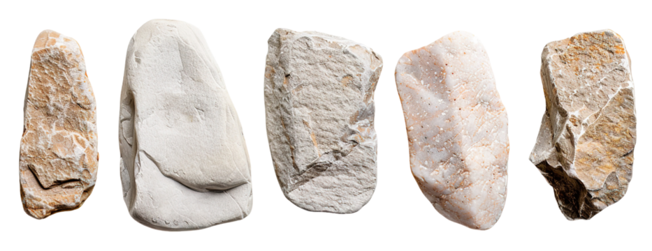 Five irregular stones appear on a clear background. These stones can be used for pathways, gardens, or outdoor features. Each stone shows unique shapes and textures
