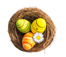 easter nest with eggs and daisy blossom from above isolated in transparent background, overlay flatlay spring decoration for easter greetings