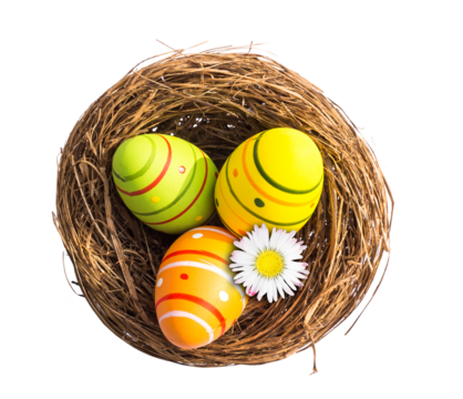 Colorful easter eggs in nest on transparent background