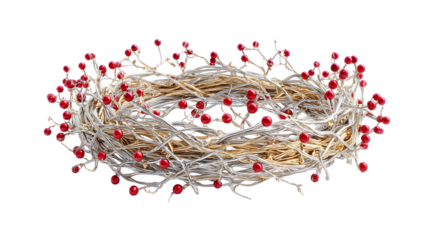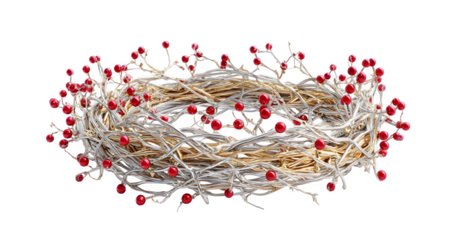 A 3D Christmas wreath made of intertwined silver and gold branches, decorated with tiny red gem berries. Luxurious and modern, isolated on white background.
