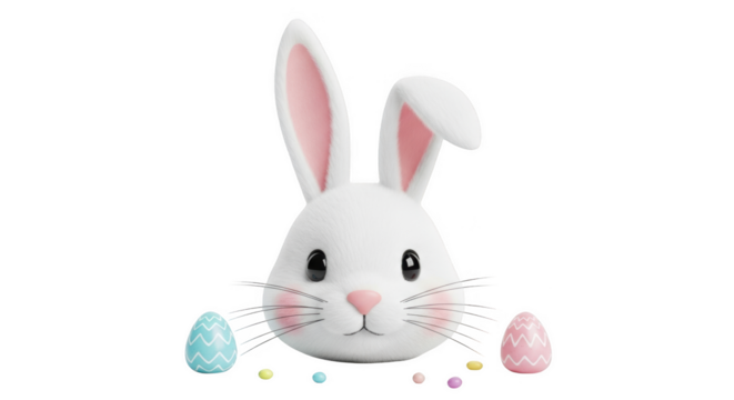 White fluffy bunny face with pink ears surrounded by colorful Easter eggs and candies isolated on a transparent background