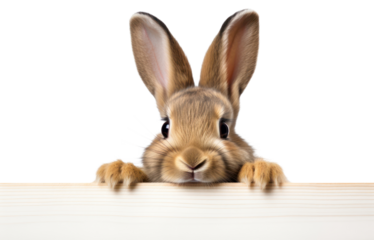 Studio portrait of cute rabbit isolated on transparent png background, happy bunny running on floor, adorable fluffy rabbit that sniffing.