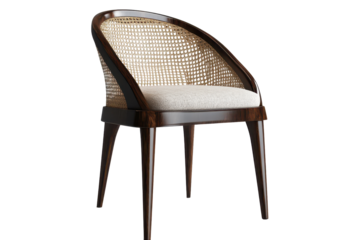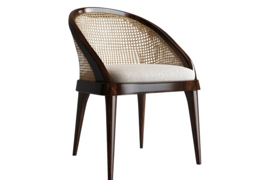 Elegant wooden chair with woven backrest and cushioned seat displayed on a transparent background