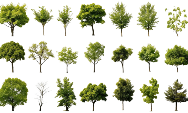 Collection of various green tree illustrations. Includes different tree types like maple, oak, pine, etc. Isolated on white background for easy use in design projects.